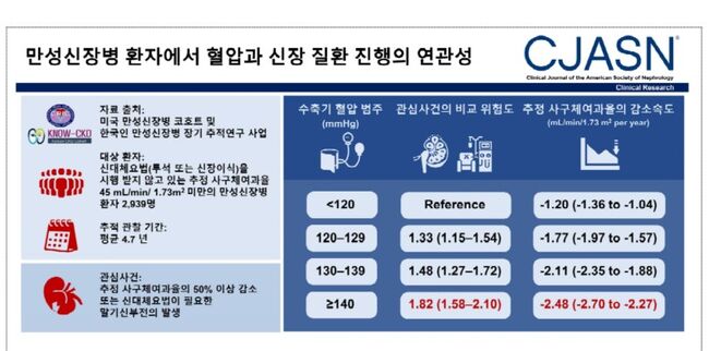 연구 결과, 수축기 혈압이 140mmHg 이상인 환자는 120mmHg 미만인 환자에 비해 신장 기능 악화 위험이 약 1.82배 높았고, 약 5년간 추적 관찰한 결과 신장 기능 감소 속도도 약 2배 빨랐다. 특히, 수축기 혈압이 120mmHg 미만인 환자군의 신장 기능 악화 발생률은 1000인년당 59.6건이었으나, 140mmHg 이상인 환자군에서는 1000인년당 140.2건으로 크게 증가했다. 또한, 기저 수축기 혈압이 120mmHg 미만인 환자와 비교해 140mmHg 이상인 환자는 신장 기능 악화의 위험이 약 1.82배로 확인됐다.