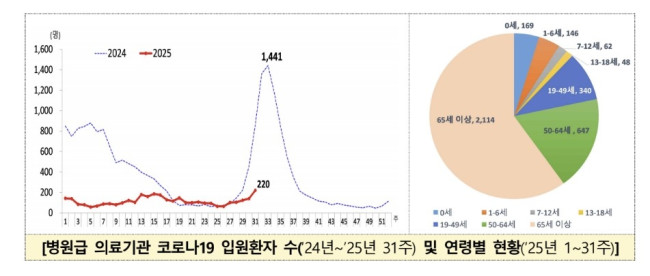 질병청이 표본 감시하는 병원급 의료기관 221개소의 지난달 27일부터 이달 2일 사이 코로나19 입원환자는 220명으로 지난 6월 말부터 5주 연속 증가했다. 다만 작년 동기(864명)보다는 입원환자가 적었다.