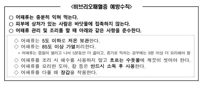 어패류는 85℃ 이상으로 충분히 가열하여 익혀 먹어야 하며 , 특히 껍질이 열린 후 5분 더 끓이거나, 증기로 익힐 경우 9분 이상 더 조리하는 것이 좋습니다.피부에 상처가 있는 사람은 오염된 바닷물에 접촉하는 것을 피해야 합니다. 어패류를 요리할 때 해수를 사용하지 말고 흐르는 수돗물에 깨끗이 씻어야 합니다. 또한, 요리에 사용한 도마, 칼 등은 반드시 소독 후 사용하고 , 어패류를 다룰 때는 장갑을 착용하는 것이 안전합니다.
