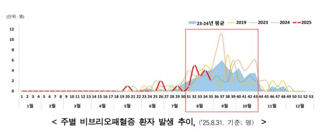 주별 비브리오패혈증 환자 발생 추이[질병관리청 제공] 질병관리청은 8월 이후 비브리오패혈증 환자가 급증함에 따라 각별한 주의를 당부했습니다. 비브리오패혈증은 해수 온도가 상승하는 8월에서 10월 사이에 환자가 집중적으로 발생하는 감염병입니다. 특히 간 질환, 당뇨병 등의 기저질환을 가진 고위험군은 치명률이 높아 더욱 주의해야 합니다.