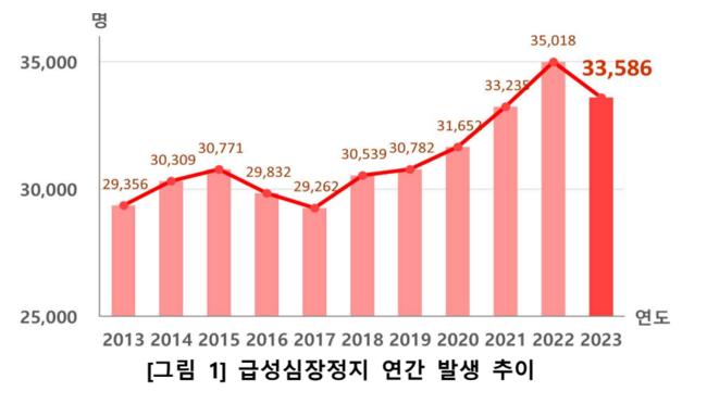 질병관리청이 공개한 **'2023년 급성심장정지조사 통계'**에 따르면, 국내 급성심장정지 발생 건수는 2013년 29,356건에서 2023년 33,586건으로 지속적인 증가세를 보이고 있다. 매년 3만 건 이상 발생하는 급성심장정지는 심장 기능이 갑자기 멈춰 혈액순환이 중단되는 응급 상황으로, 신속한 대처가 이루어지지 않으면 사망에 이를 수 있다.