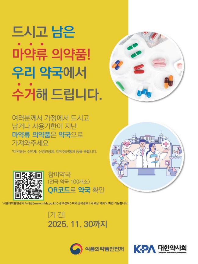 또한, 식약처는 오남용 시 중독, 심각한 부작용, 심지어 사망에 이를 수 있는 마약류의 위험성을 강조하며, 가정에서 사용하고 남은 마약류 의약품을 약국이나 종합병원 내 약국에 반납하여 안전하게 폐기할 것을 권고하고 있다. 2025년 기준으로 총 100개의 약국과 5개의 종합병원이 이 수거·폐기 사업에 참여하고 있다. 참여 약국 목록은 식품의약품안전처 누리집(www.mfds.go.kr)의 '정책정보 → 마약 정책정보 자료실'에서 확인할 수 있다.