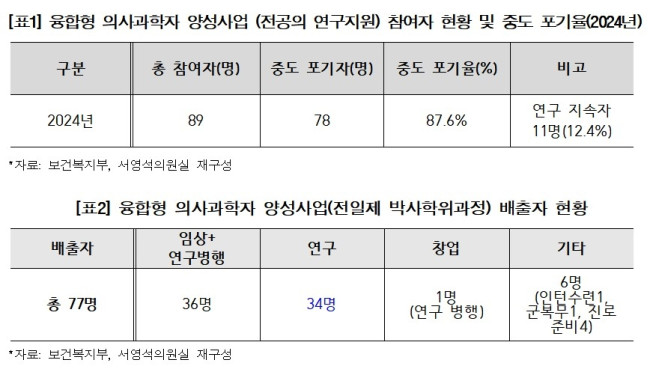 22일 국회 보건복지위원회 소속 더불어민주당 서영석 의원이 보건복지부로부터 제출받은 자료에 따르면 지난해 융합형 의사과학자 양성사업(전공의 연구지원사업) 참여자 89명 중 78명(약 88%)이 중도 포기했다.