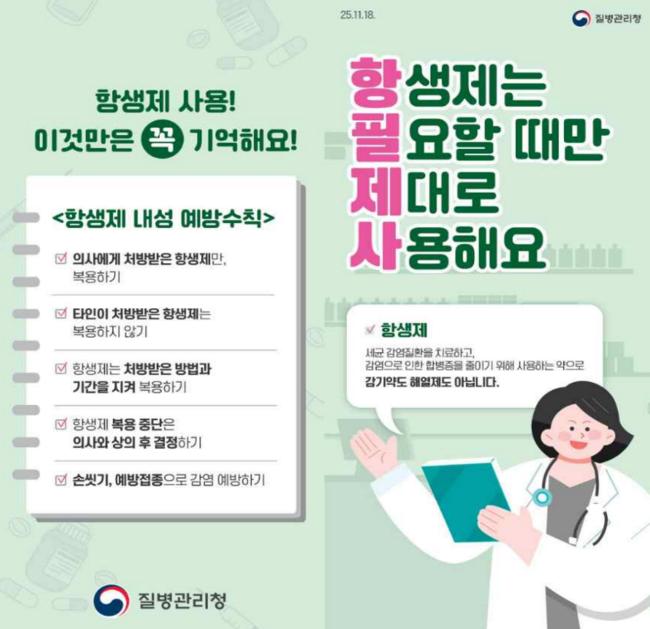 다만, 항생제 내성은 '예방이 가능한 위협'이며 , 질병관리청(청장 임승관)은 「세계 항생제 내성 인식주간(매년 11. 18.~11.24.)」을 맞아 올바른 항생제 사용 문화 확산을 위한 홍보 캠페인을 추진한다고 밝혔다.