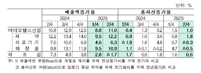 수익성 지표에서는 매출액영업이익률이 전년 동분기 대비 큰 폭으로 상승하며 영업 효율성이 개선되었음을 시사했다. 바이오헬스산업 전체 매출액영업이익률은 2024년 2분기 10.7%에서 2025년 2분기 14.7%로 4.0%p 상승했다. 이는 전체 제조업의 매출액영업이익률(7.1% → 5.1%)이 하락한 것과 대조적이다.