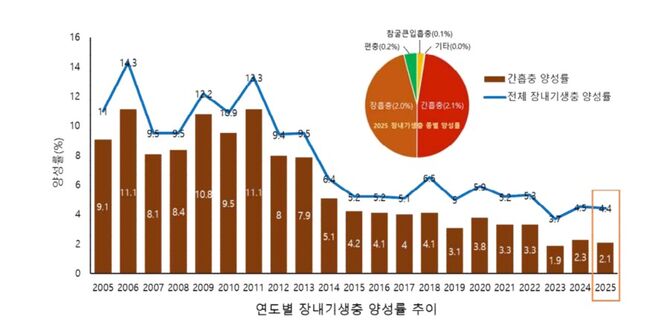 2025년 장내기생충질환 조사사업은 질병관리청 주관으로 전국 5대강(한강, 낙동강, 금강, 섬진강, 영산강) 주변 장내기생충 감염 유행지역 39개 시·군·구 주민 총 25,834명을 대상으로 실시됐다. 조사 결과, 전체 장내기생충 양성률은 4.4%로 전년(4.5%) 대비 0.1%p 감소했다. 특히 대표적 장내기생충인 간흡충 양성률은 2.1%로, 전년(2.3%) 대비 0.2%p 감소했다.