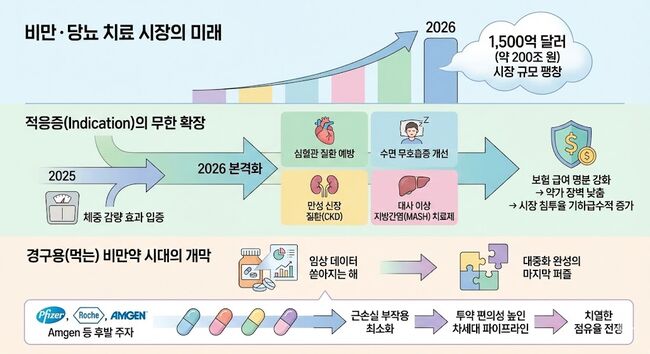 시장 조사 기관들의 데이터를 종합하면, 2026년 비만 및 당뇨 치료제 시장 규모는 1,500억 달러(약 200조 원) 규모로 팽창할 전망이다. 주목할 점은 적응증(Indication)의 무한 확장이다. 2025년까지가 체중 감량 효과 입증에 주력했던 시기라면, 2026년은 심혈관 질환 예방, 수면 무호흡증 개선, 만성 신장 질환(CKD), 그리고 대사 이상 지방간염(MASH) 치료제로의 라벨 확장이 본격화되는 해다. 이는 곧 보험 급여 등재의 명분이 강화됨을 의미하며, 높은 약가 장벽을 낮추어 시장 침투율을 기하급수적으로 높이는 기폭제가 될 것이다.