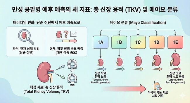 하지만 최근에는 단순 진단을 넘어, 향후 신장 기능이 얼마나 빨리 나빠질지를 예측하는 것이 더 중요해졌다. 이에 따라 CT나 MRI로 측정한 '총 신장 용적(Total Kidney Volume, TKV)'이 핵심 지표로 떠올랐다. 환자의 키를 보정한 신장 크기를 기준으로 예후를 1A부터 1E까지 5단계로 나누는 '메이요 분류(Mayo Classification)'가 그것이다. 1E 등급에 가까울수록 신장이 크고 진행 속도가 빠르다는 뜻이며, 이는 적극적인 약물 치료를 시작하는 기준이 된다.