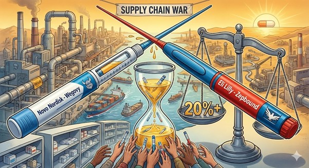 글로벌 제약 시장이 비만 치료제라는 거대한 '골드러시'에 휩싸였다. 덴마크의 노보 노디스크(Novo Nordisk)가 쏘아 올린 '위고비'의 성공 신화에 미국의 일라이 릴리(Eli Lilly)가 '젭바운드'로 강력한 도전장을 내밀며, 시장은 바야흐로 양강(Duopoly) 체제로 재편되었다. 하지만 이 화려한 랠리의 이면에는 폭발적인 수요를 감당하지 못하는 '공급망 병목(Bottleneck)'이라는 심각한 과제가 도사리고 있다.