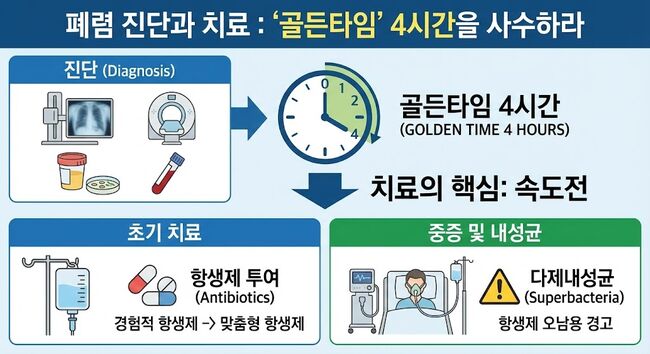치료의 핵심은 ‘속도전’이다. 의료계에서는 폐렴 증상 발현 후, 혹은 병원 도착 후 4~8시간 이내에 적절한 항생제를 투여하는 것을 권장한다. 이 ‘골든타임’을 지켰을 때 사망률이 유의미하게 감소한다는 연구 결과가 이를 뒷받침한다. 초기에는 경험적 항생제 치료를 시작하며, 이후 배양 검사 결과에 따라 원인균에 맞는 맞춤형 항생제로 변경한다.