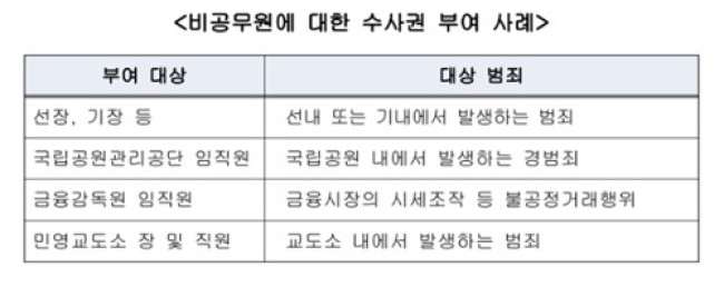 법사위 전문위원실 검토보고서에 따르면 현행법상 비공무원에게 수사권을 부여하는 사례는 선장이나 기장의 경우 선박·항공기 안에서 발생하는 범죄, 금융감독원 임직원의 경우 자본시장 불공정거래행위에 대한 범죄, 민간교도소장의 경우 교도소 내에서 발생하는 범죄 등이 있다.