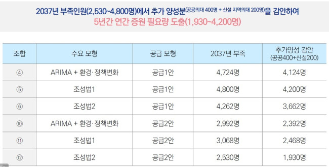 다만, 여기에 2030학년도부터 신입생을 모집할 수 있을 것으로 보이는 공공의대와 지역신설의대에서 2037년까지 모두 600명의 의사를 배출할 것이라는 가정을 더하면, 현재 운영중인 비서울권 의대의 실제 증원 규모는 1천930명에서 4천200명 사이에서 논의될 전망이다.