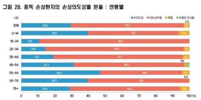 중독을 포함한 생애주기별 의도성 자해 환자 입원율(인구 10만 명당)은 65세 이상 노인이 62명으로 가장 많았고, 청소년(13∼18세) 56명, 청장년(19∼64세) 34명, 어린이(0∼12세) 1명 순이었다.
