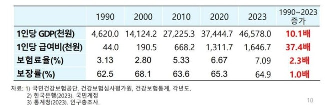 김 교수는 "1989년 건강보험 도입 이후 1990∼2023년 1인당 국내총생산(GDP)은 10.1배 늘어난 반면 1인당 건강보험 급여비(진료비 중 본인부담금을 제외하고 공단이 지급한 금액)는 37.4배 늘어 재정 지출이 국민 소득에 비해 3.7배 이상 더 증가했다"고 지적했다.