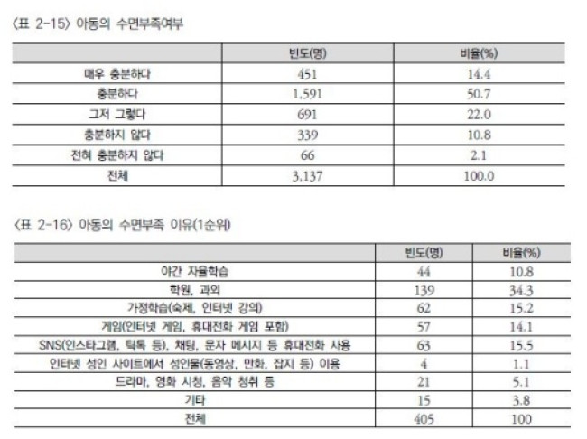 한국보건사회연구원(보사연)의 '2023년 아동종합실태조사 심층분석 연구' 보고서에 담긴 아동의 수면부족 여부와 이유. 2025.08.10. [보고서 갈무리. 연합뉴스 사진]