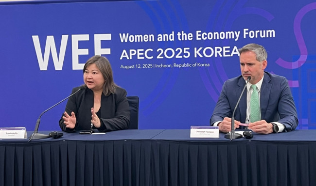"일·가정 양립에는 주 4일제보단 '유연근무제'가 더 적합". 12일 인천 송도에서 열린 아시아태평양경제협력체(APEC) 여성경제회의(WEF)에서 취재진의 질문에 답하는 분휘 이 머크 헬스케어 외부전략협력·파트너십글로벌 부사장(왼쪽)과 크리스토프 하만 한국머크 헬스케어 대표. 2025.8.12 [여성가족부 제공. 연합뉴스 사진] (끝)