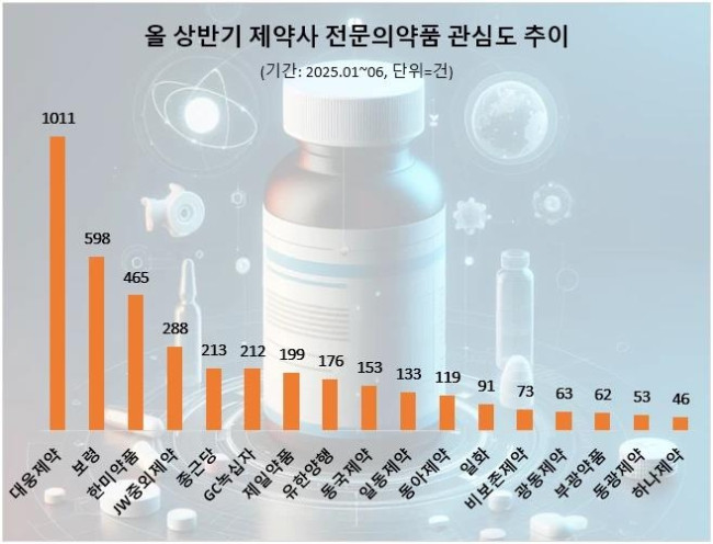 보령[003850]과 한미약품[128940]이 각각 598건과 465건을 기록하며 2위와 3위에 올랐다.