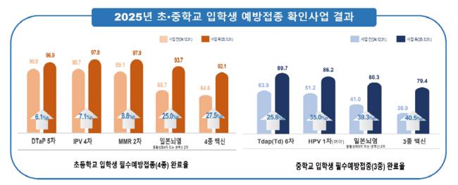 초등학교 입학생은 DTaP(디프테리아/파상풍/백일해) 5차, IPV(폴리오) 4차, MMR(홍역/유행성이하선염/풍진) 2차, 일본뇌염(4차 또는 2차) 등 총 4종의 백신 접종 여부를 확인한다. 사업 전인 2024년 12월 31일 기준으로 이 네 가지 백신을 모두 완료한 학생은 64.6%에 불과했으나, 사업 후인 2025년 5월 31일에는 92.1%로 크게 올랐다. 특히 일본뇌염 백신의 경우 사업 전 완료율이 68.7%였지만, 사업 후에는 93.7%까지 상승하며 가장 높은 증가율을 보였다. 이는 초등학교 입학생 전체 완료율 상승을 견인하는 데 기여했다.