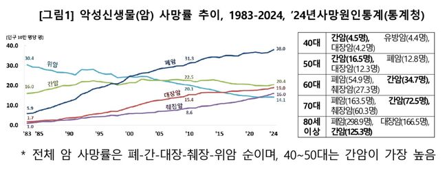 특히 40~50대 중장년층에서 암종별 사망 원인 1위로 꼽히는 간암의 주요 원인 질환 중 하나가 바로 C형간염이다. 통계청의 2024년 사망원인통계에 따르면 40대와 50대에서 간암으로 인한 사망률은 다른 암종을 압도하는 수준이다.