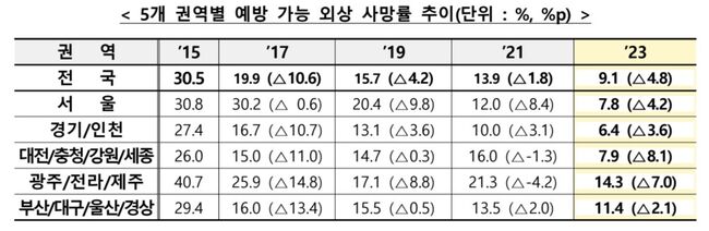 대한민국의 예방 가능 외상 사망률은 조사가 시작된 이래 꾸준히 감소해 왔다. 연도별 추이를 살펴보면 ▲2015년 30.5% ▲2017년 19.9% ▲2019년 15.7% ▲2021년 13.9%를 거쳐 2023년 마침내 9.1%를 기록하며 첫 한 자릿수 진입이라는 금자탑을 쌓았다.